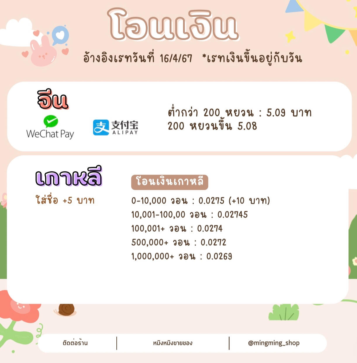 โอนเงิน หยวน / วอน 📝โอนเงิน ₊˚จีน : 4.95-5.06 เกาหลี : 0.0275-0.0269 (4 ทุ่มไทยจะติดเที่ยงคืนเกาหลี)〰️ 1. แจ้งธนาคารหรือ qr code 2. แจ้งยอดที่ต้องการโอน*เรทเบื้องต้นเป็นเรทณ วันที่ 16/4 **เรทอาจมีการเปลี่ยนแปลงเล็กน้อย
